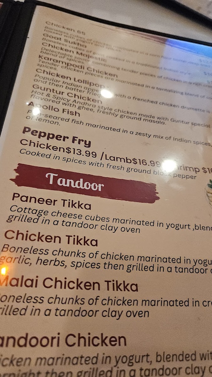 Shrimp marinated in yogurt, blended with ginger, garlic, herbs, spices then grilled in a tandoor clay oven